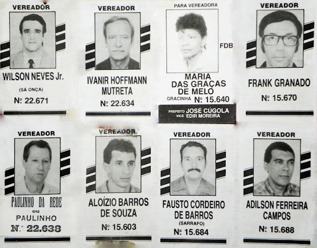 Só que se tratavam de santinhos de candidatos a vereador nas eleições de 1988, quando ocorreu a disputa entre José Cúgola e Jacyr Moreira para o cargo de prefeito, vencido por este último.